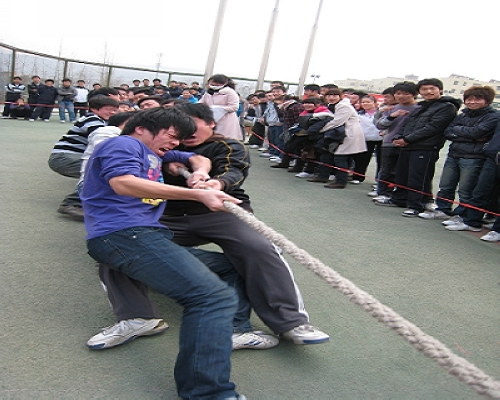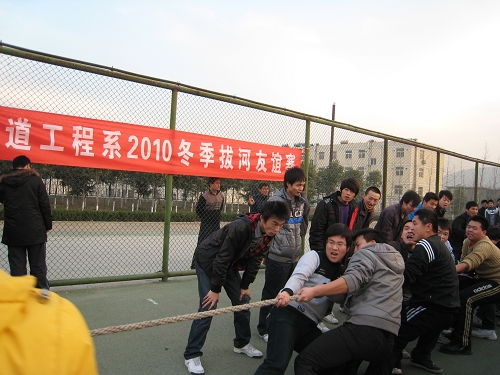 近日,铁工系0907级举行了2010年冬季拔河友谊赛。 全程十几场的比赛,场场扣人心弦,双方队员都紧紧抓牢手中的绳子,下腰勒绳,重心降低,齐心协力往后拉,围得水泄不通的啦啦队也都在场有节奏的呐喊助威。选手们使尽全力,奋勇拼搏。每一支参赛队,每一个队员全力以赴,赛出了顽强的精神、团结的风尚!比赛丰富了同学们的课余文化生活,增强了集体凝聚力。(供稿:陈晓艾)