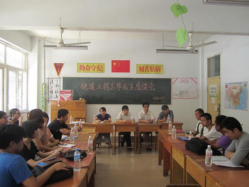 78,铁道工程系在B103室召开毕业生座谈会,系党总支书记亢新河、系主任张碧及各教研室主任出席了座谈会,2011届毕业生代表参加了会议。会上,系领导对2011届毕业生顺利完成学业表示衷心祝贺,并就毕业生文明离校等工作提出了要求,希望同学们志存高远,善于思考,勤于实践,为母校争光添彩。参加座谈会的毕业生们深情回忆了自己的大学生活,畅谈了自己的体会和感受,对学院的培养教育表达了深深的谢意,他们也一致表示:在校内将继续站好最后一班岗,文明离校;在今后的工作中,不断继承发扬陕铁院“吃苦奉献、拼搏争先”的陕铁院精神,为母校争光,为社会、为国家多作贡献。(张团结供稿)
