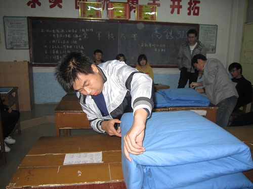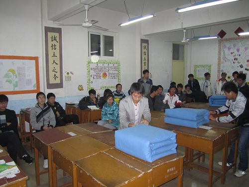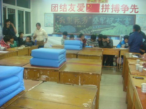 为进一步培养新生良好的生活习惯,继续提高学生宿舍文明优化生活环境,11月28日晚,我系11级新生在各班教室举办了别开生面的叠军被大赛。在限时五分钟的比赛中,每位参赛选手都能做到专心致志、精益求精,许多同学以沉稳而迅速的叠军被技术,赢得了阵阵掌声。