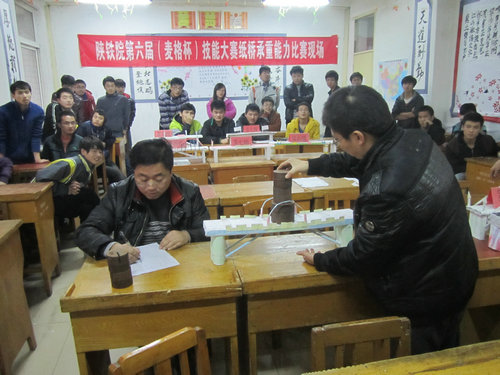 在施工临时结构检算项目决赛中,参赛选手沉着冷静、积极思考,利用计算机Ansys软件熟练绘制出钢箱梁架设施工贝雷架支架的内力图和挠度图,并完成施工临时结构的强度与刚度检算任务;在纸桥承重能力项目决赛中,参赛选手根据比赛项目要求及提供的制作材料、工具,经过认真讨论研究、设计方案确定、构造尺寸量测、桥梁精心制作、外观装饰美化等程序完成纸桥制作,随后,大赛评委统一对各组设计制作的纸桥进行承重能力测试。
