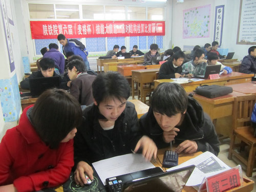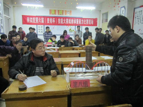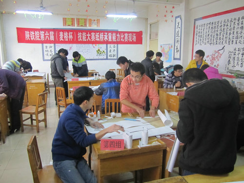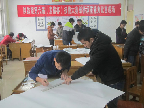 在施工临时结构检算项目决赛中,参赛选手沉着冷静、积极思考,利用计算机Ansys软件熟练绘制出钢箱梁架设施工贝雷架支架的内力图和挠度图,并完成施工临时结构的强度与刚度检算任务;在纸桥承重能力项目决赛中,参赛选手根据比赛项目要求及提供的制作材料、工具,经过认真讨论研究、设计方案确定、构造尺寸量测、桥梁精心制作、外观装饰美化等程序完成纸桥制作,随后,大赛评委统一对各组设计制作的纸桥进行承重能力测试。
