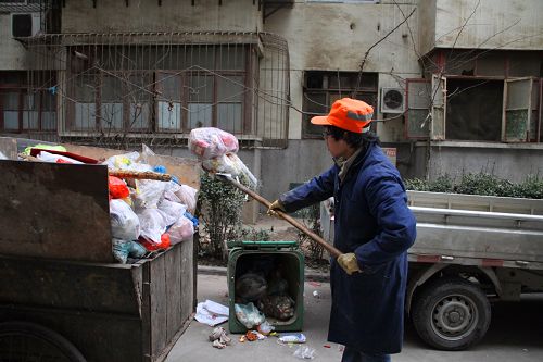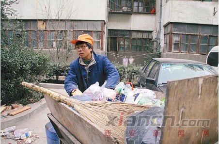 每天早上4时多,王鹏便起床开始准备了,5时左右他就和父母开始对小区内卫生进行清理和打扫。每次打扫完毕,懂事的王鹏便让母亲先回屋里休息一会儿,自己推着三轮车再将一桶桶、一堆堆垃圾装上车。