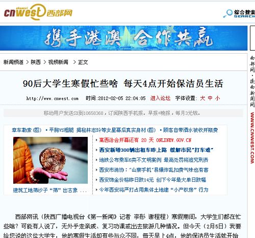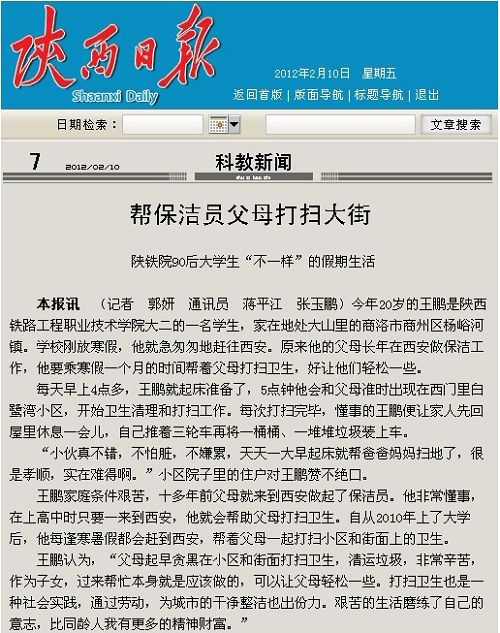 王鹏的老家地处大山里的商洛市商州区杨峪河镇,家庭条件艰苦,十多年前父母就来到西安做起了保洁员。王鹏非常懂事,还在上高中时,只要一来到西安,他就会帮助父母打扫卫生。自从2010年上了大学后,他每逢寒暑假都会从渭南赶回西安,帮着父母一起打扫小区和街面上的卫生。
