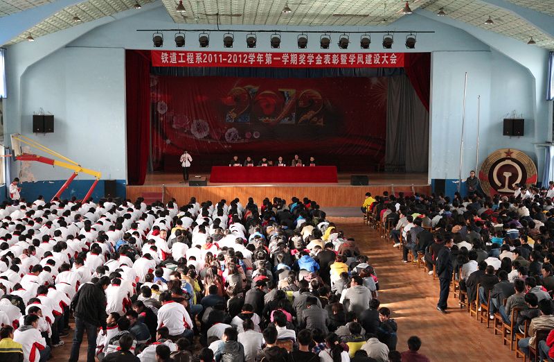 2012年3月30日(星期五)下午16点,铁道工程系2011-2012学年第一学期奖学金表彰暨学风建设大会在学院文体中心顺利召开。学院党委副书记车绪武教授、铁道工程系党总支书记亢新河老师、铁道工程系主任张碧老师、学院团委副书记刘渭峰老师、铁道工程系办公室主任张团结老师、副主任任庆国老师及全体辅导员、班主任老师出席了本次会议。