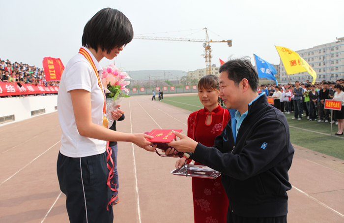 焦胜军为我系打破跳高记录获奖选手樊凯圆同学颁奖