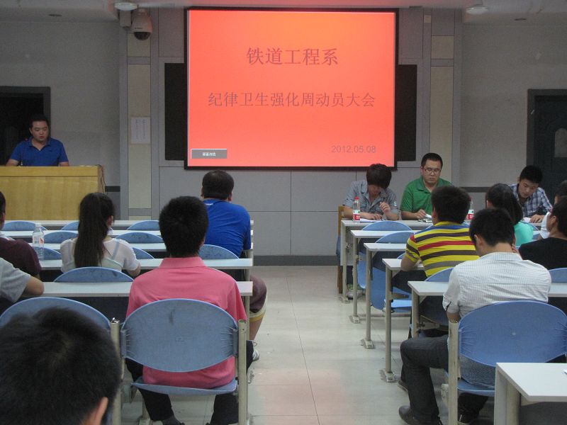 5月8日下午,铁道工程系团总支学生会纪检部在B300教室召开了纪律卫生强化周动员大会,辅导员侯峰老师与系学生会成员、各班班团委代表促膝长谈。本次会议主要对纪律卫生强化周活动进行了安排和部署。