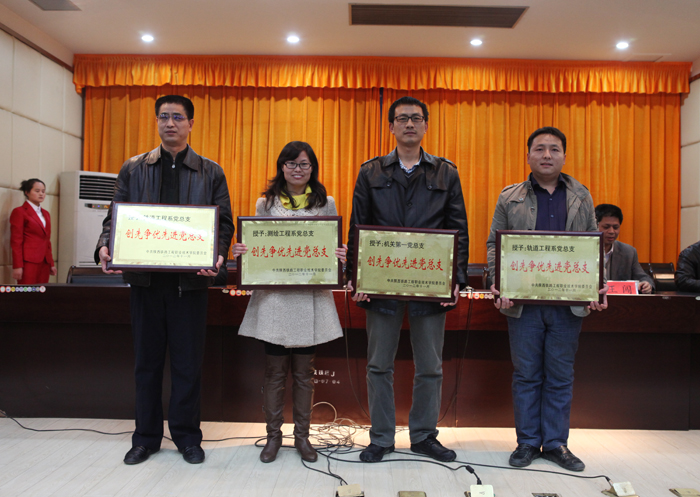 为全面总结2010年以来学院创先争优活动成果和经验,表彰先进典型,11月29日下午,学院在学术报告厅召开创先争优总结表彰大会。党委书记王晖,党委副书记车绪武,党委副书记、纪委书记杨云峰,党委委员、副院长王闯、焦胜军、李林军出席大会,全院教职工党员、学生党员代表近四百人参加了大会。大会由车绪武主持。 杨云峰副书记首先了宣读了学院党委《关于表彰创先争优活动先进集体和先进个人的决定》。随后,出席大会的学院领导向受到表彰的先进集体颁发了奖牌。学院授予铁道工程系党总支“创先争优先进党总支”称号,授予张碧、朱永伟、郝付军、苗兰弟“创先争优先进个人”称号。