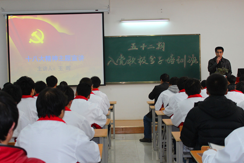 在培训班上,王晖书记提纲挈领地讲解了十八大会议的重要思想,从五个方面对十八大会议做了深入剖析。他回顾了科学发展观的产生、发展及最后确立为党的指导思想的过程,带领同学们学习了十八大报告中对中国特色社会主义的科学内涵做出的新概括、新阐释,以及对全面建成小康社会工作的新要求,深入解读十八大报告中出现的新名词、新要求、新变化,并结合国际国内形势论证了党的指导思想的正确性、科学性和必要性,从我国政治、经济、外交等多方面的政策、实践出发引导同学们进一步坚定中国特色社会主义的道路自信、理论自信、制度自信。讲座内容丰富,条理清晰,结构严谨,使在场的同学深入了解了党的十八大和领会十八大的精神,并不时博得了阵阵掌声。最后,王晖强调,作为一名入党积极分子:一是要坚定理想信念,胸怀报国之志;二要充实学业基础,练就过硬本领;三要培养职业精神,坚持高尚品格。希望入党积极分子通过自己不懈的努力和追求,严格按照党员标准约束自己,早日成为一名合格的共产党员。