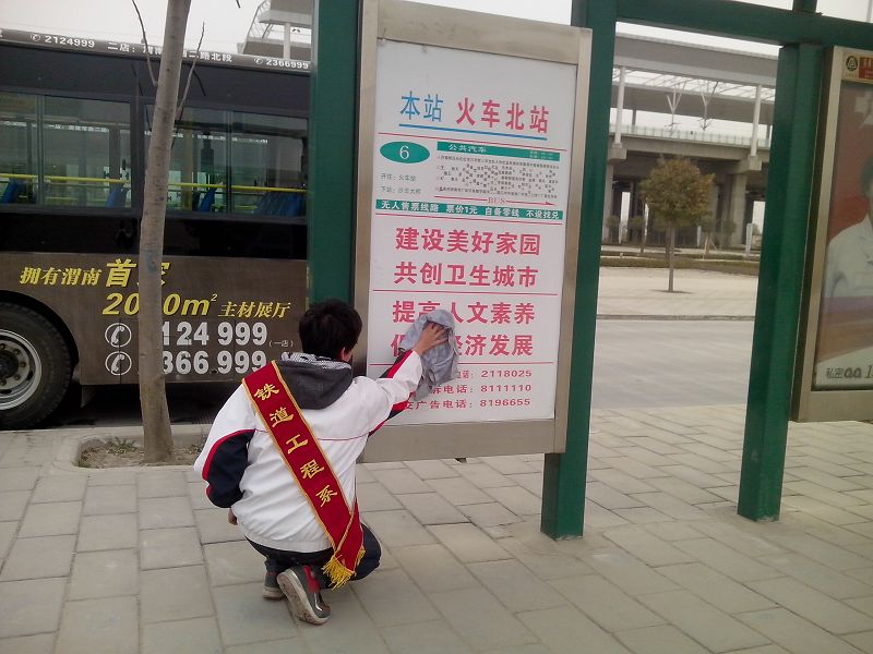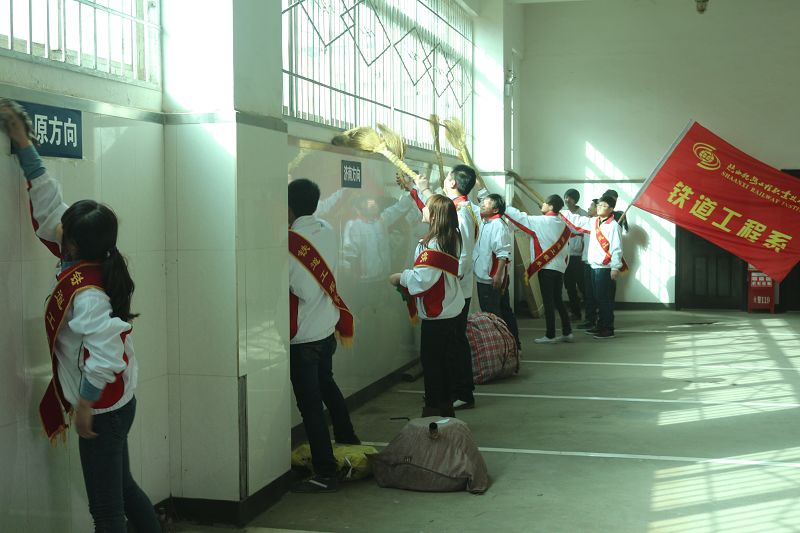 由万老师带领的第二支队伍步行到渭南火车站,途中铁道工程系系旗迎风飘扬,同学们整齐的步伐和统一的校服成为一道亮丽的风景线,吸引了周围人民的眼球,赞许之声不绝于耳。到达火车站后,同学们就得到火车站王部长和蔡主任的热情接待。在蔡主任的安排下,同学们积极的投入到劳动中,打扫候车厅、售票厅、擦玻璃、清洗护栏,以实际行动践行雷锋精神,此次活动得到火车站工作人员以及旅客们的一致好评,也吸引了渭南晚报实习记者的关注。