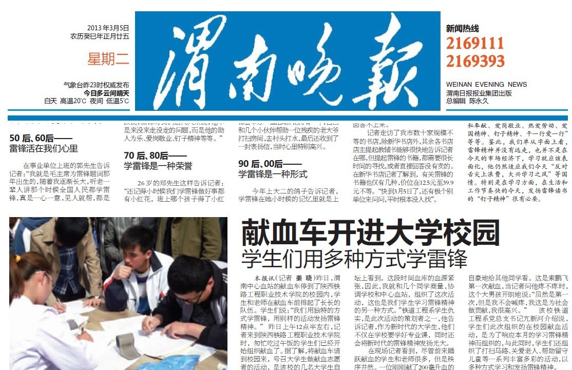 3月4日上午12:00,铁道工程系在学院A楼前积极开展“弘扬雷锋精神,荐我热血,点燃他人生命之光”义务献血活动。此活动得到陕西卫视新闻联播、渭南新闻综合、陕西省教育厅网站、中国教育报、渭南晚报、渭南日报、陕西农村网的报道。