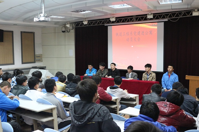 为加强和改进铁道工程系党建工作,3月6日,铁道工程系团总支在B100召开新学期党建工作大会。辅导员万仁远、冯利斌老师出席大会,参会的还有学生会主席团以及100余名积极分子。