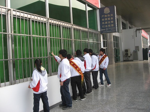 同学们的到来受到火车站王主任和工作人员的热情接待和积极支持。在王主任的安排下,同学们积极地投入到劳动当中,分别到候车室、售票厅、出站口、站前广场、站台等各个角落认真的打扫卫生。有的同学清扫地面,有的同学擦洗桌椅、墙壁、栏杆等,有的同学主动搀扶年迈的旅客上下车,有的同学帮助旅客提行李,受到了车站工作人员和旅客的好评。车站领导及工作人员通过广播对此次的活动给予了赞扬和感谢,还表示将要通过微博进行报道。