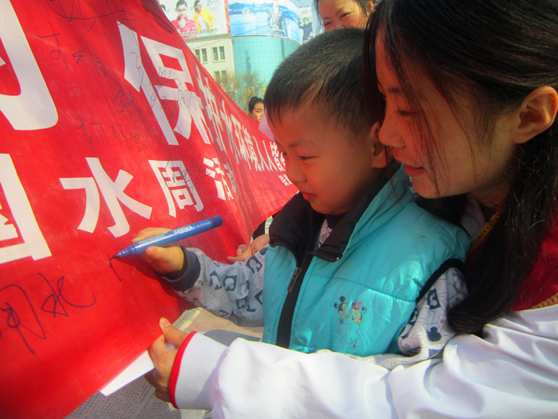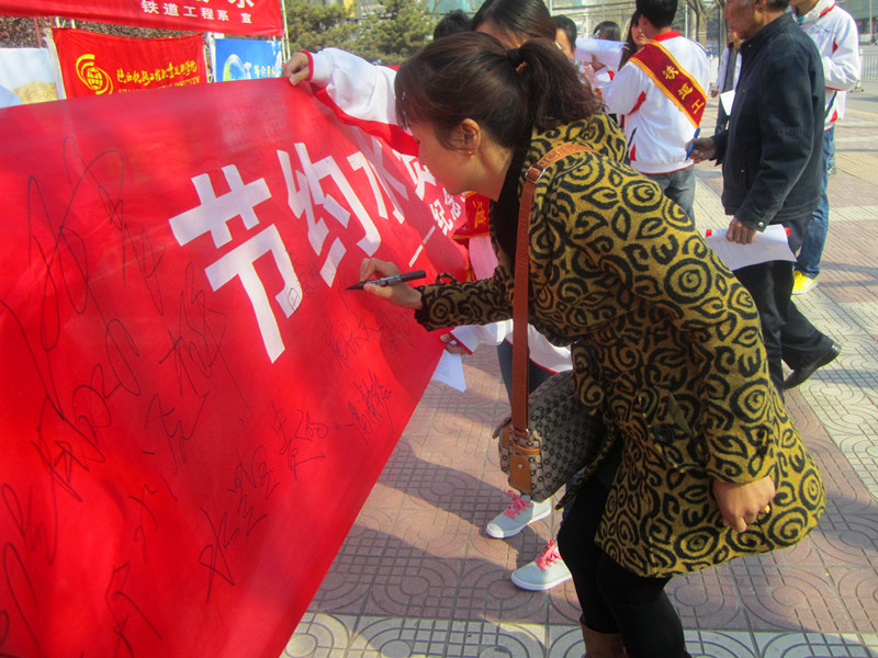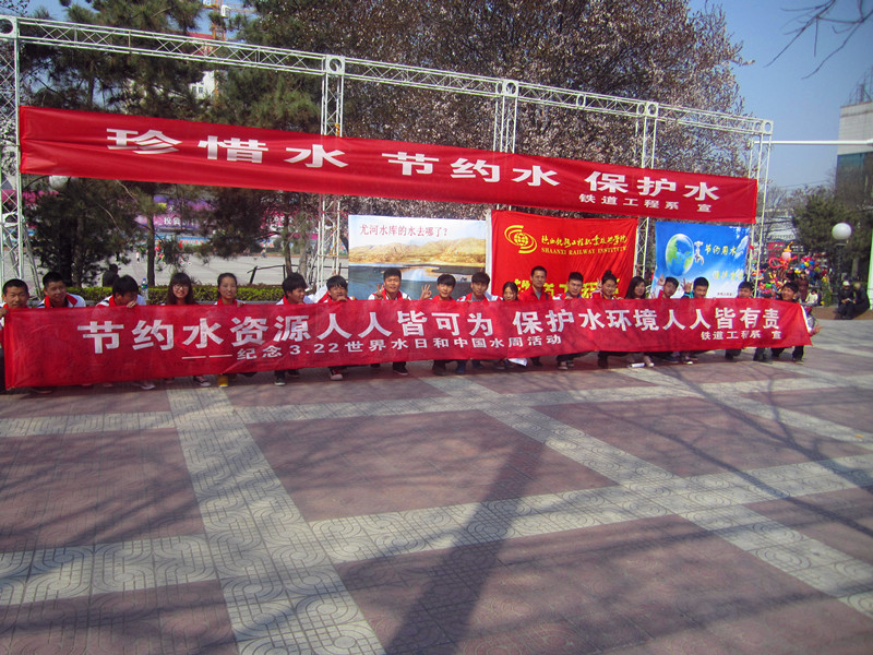 2014年3月22日是第二十二届“世界水日”、第二十七个“中国水周”。 今年世界水日的主题是“加强河湖管理,建设水生态文明”。 为了纪念世界水日,唤起广大市民的节水意识,加强水资源保护,宣传人与自然和谐相处的理念。当天上午9时,铁道工程系20余名学生在渭南市中心广场举行了“节约水资源人人皆可为,保护水资源人人皆有责”的宣传活动,并通过宣传横幅、展板、发放节水宣传单、签名等形式,向广大市民宣传、介绍“世界水日”、“中国水周”及我国水资源、渭南城区自来水供应日趋紧张、日常节约用水窍门等,唤醒广大市民的节水意识,呼吁公众保护有限的淡水资源,促进社会对水资源可持续发展的持续关注。