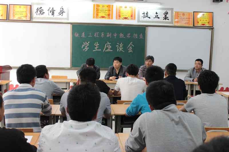 2014年5月7日,铁道工程系在GB236、GB240、GB244、GB248教室分专业召开期中教学检查师生座谈会。铁道工程系领导班子、各教研室主任、骨干教师及班级学生代表参加了座谈会。