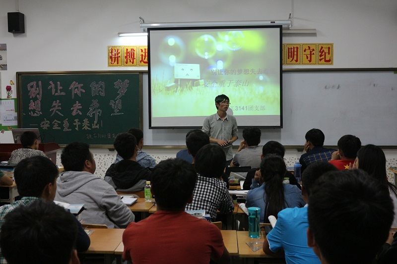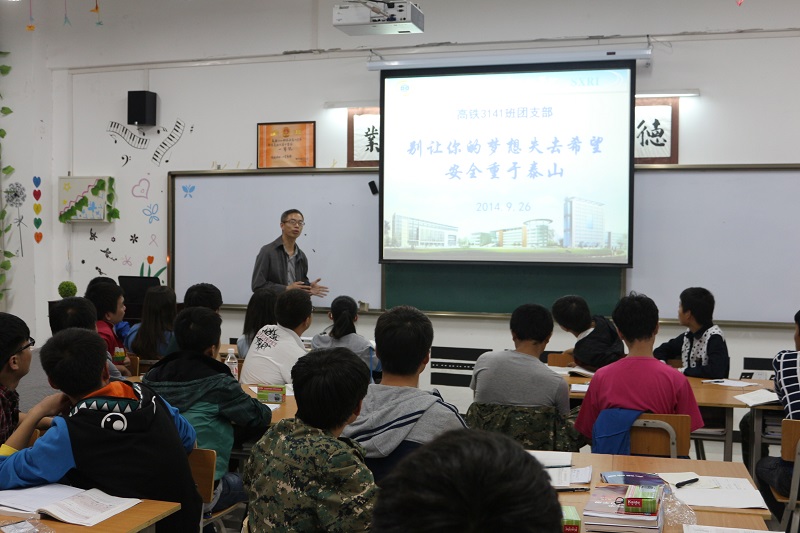为了使同学们能够度过一个安全快乐的假期,9月26日,陕铁院铁工系2014级新生在各班级召开了以“别让梦想失去希望,安全重于泰山”的主题班会,各班主任认真为同学们介绍安全知识,告诫同学们归家路上勿坐黑车、勤工俭学勿入传销、旅途游玩勿信邪教。(冯利斌/文 张禹/图)