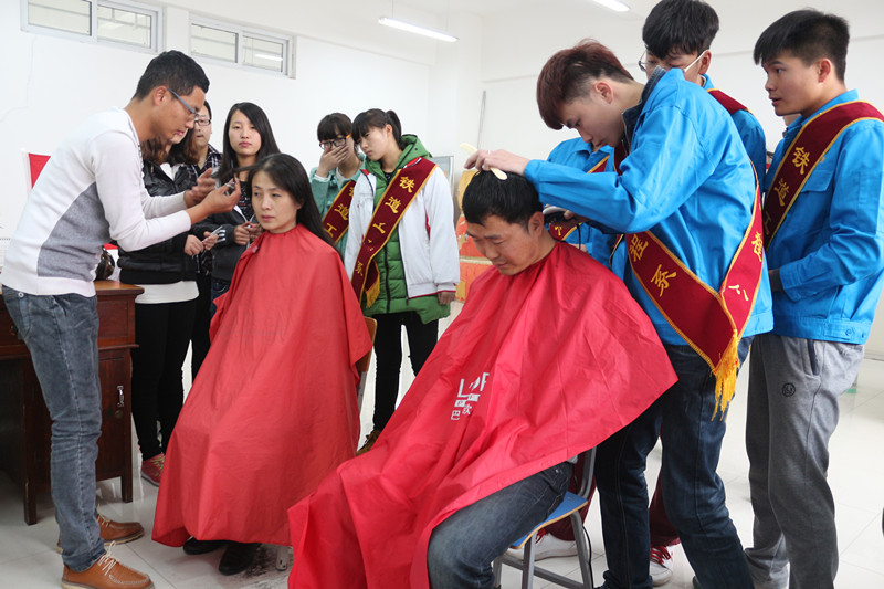11月21日中午,在陕铁职院铁道工程系某辅导员办公室里,有一批特殊的“理发师”,他们正在为该学院的辅导员义务理发,这一群“理发师”均为该学校铁工系的在校大学生,他们利用课余时间自学理发,奉献爱心,传递爱的正能量。在寒冷的冬季,同学们用特殊的方式表达着一份特殊的爱,对辛勤培育他们的老师表达感恩之心和祝福之情,回赠老师们平日的付出和关爱,整个办公室里充满着浓浓的师生之情。