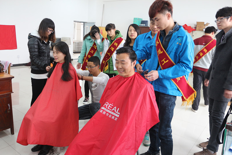 11月21日中午,在陕铁职院铁道工程系某辅导员办公室里,有一批特殊的“理发师”,他们正在为该学院的辅导员义务理发,这一群“理发师”均为该学校铁工系的在校大学生,他们利用课余时间自学理发,奉献爱心,传递爱的正能量。在寒冷的冬季,同学们用特殊的方式表达着一份特殊的爱,对辛勤培育他们的老师表达感恩之心和祝福之情,回赠老师们平日的付出和关爱,整个办公室里充满着浓浓的师生之情。