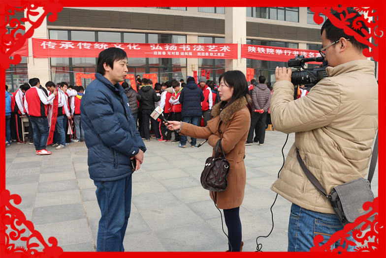 渭南高新区书法家协会主席陈龙在渭南电视台记者采访中谈到:传承中国传统文化,弘扬书法艺术,是书法家协会的重要职责,通过书法走进大学校园、开展送春联送祝福活动,与陕铁院搭建友谊的桥梁,也为陕铁院师生送去节日最美好的祝福;铁工系学生张劲松同学表示:能将书法家写的对联带回家非常高兴,比起那些买来的春联更加有意义,更能体现出过年的喜庆!”院团委书记黄新静谈到:通过此次活动,让广大陕铁院师生近距离感受到了书法家的风采,增强了对中国传统文化及精神的了解和弘扬。是陕铁院贯彻落实十八大关于加强中华优秀传统文化传承的具体举措之一,也是陕铁院校园文化建设的重要载体之一。