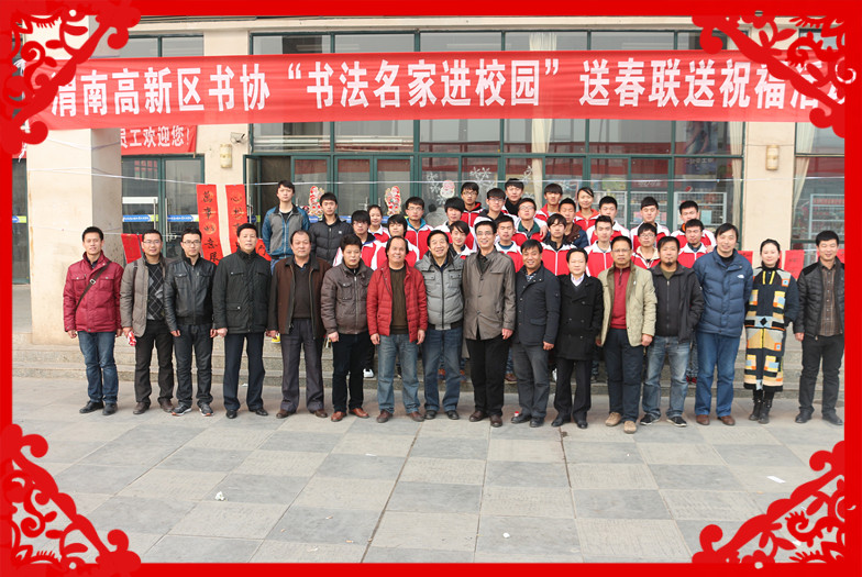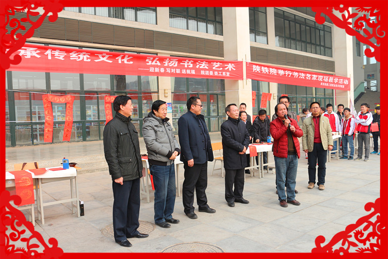过年贴对联是中华民族的古老传统,它象征着吉祥如意,表达着人们向往美好生活的民族风俗。为了迎接羊年的到来,1月14日,由陕铁院院团委、渭南高新区书法家协会联合主办、铁道工程系等四个系部共同承办的“迎新春,写春联,送祝福”活动在高新校区餐厅广场前隆重举行。学院党委副书记车绪武、学生处处长、学工部部长亢新河,院团委书记黄新静、各系部书记,渭南高新区党群工作部副部长陈立,渭南高新区书法家协会主席陈龙及十几位书法家出席活动。
