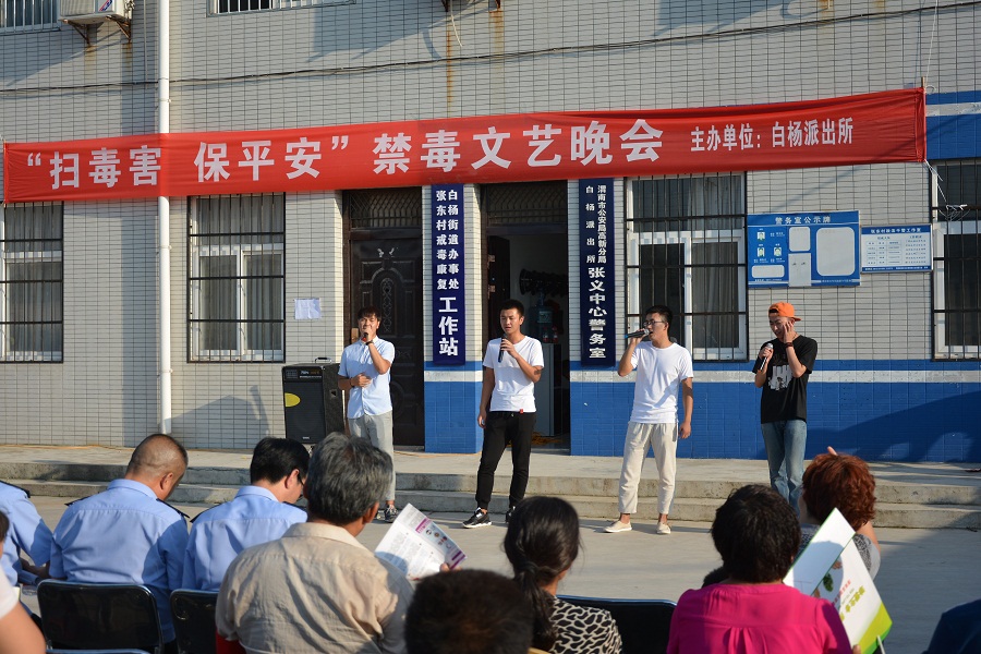 为加大禁毒宣传的深度和广度,营造浓厚的禁毒氛围,使广大人民群积极参与禁毒斗争,逐步提高认识毒品、远离毒品、抵制毒品的能力。 2015年6月25日下午,在“6·26”国际禁毒日来临之际,由渭南市高新分局白杨派出所联合陕铁院铁工系和轨道系举办以“扫毒害,保平安”为主题的禁毒文艺晚会在张东村隆重举行。此次晚会白杨派出所和陕铁院积极筹备,精心组织,以文艺活动的形式开展宣传。轻松、活泼、幽默、诙谐的语言类、歌舞类节目生动形象地诠释了毒品对人身和家庭的危害,渲染了远离毒品健康生活的和谐美好。本次禁毒宣传主题晚会,参与人数多、声势大、效果好,有效的提升了广大人民群众拒毒、防毒的意识。得到现场市民的一致好评。此次晚会也吸引来渭南电视台的记者前来采访报道。
