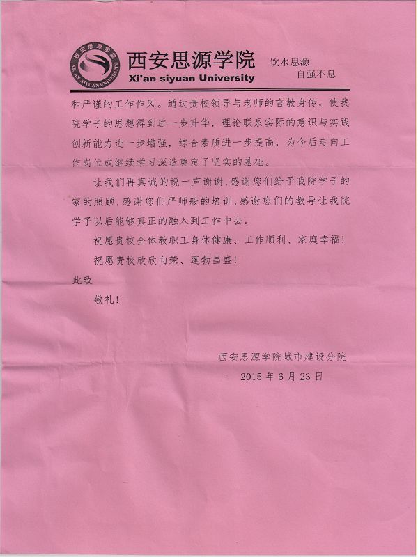 近日,西安思源学院城市建设分院向学院发来感谢信,感谢学院在为他们的实习提供了良好的实践教学条件和实习过程中指导教师全方位的悉心指导。(朱永伟)