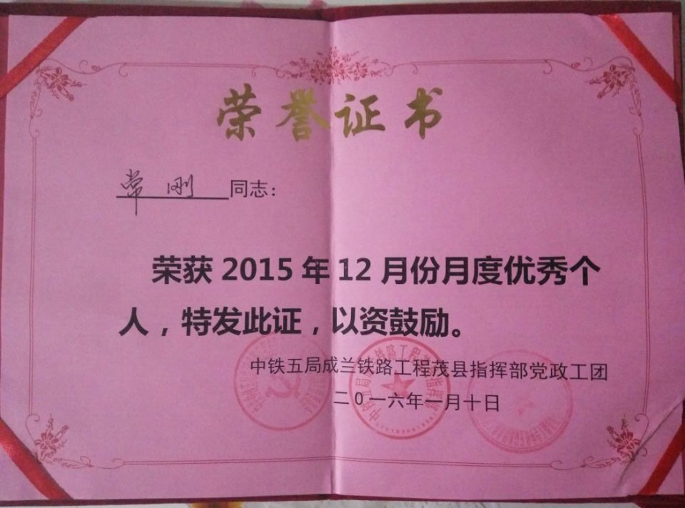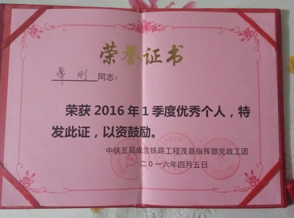 近日,铁工系顶岗实习生常刚同学荣获中铁五局成兰铁路工程茂县指挥部党政工团2016年第一季度“优秀个人”,该生也是第二次获得此项荣誉,获得了企业的高度评价。