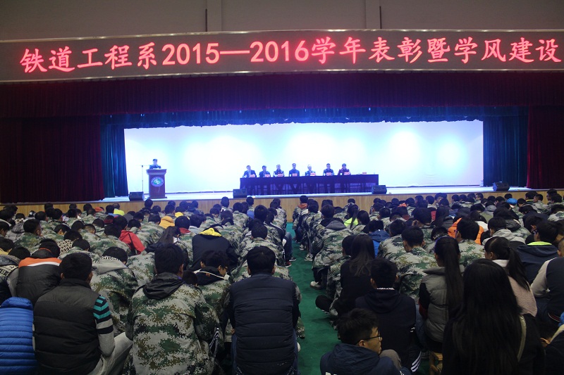 11月1日晚,铁道工程系2015-2016学年表彰暨学风建设大会在高新校区文体中心隆重举行,学院党委副书记车绪武教授,学生处处长亢新河、教务处副处长王云波、学生处副处长李昌锋,铁工系主任张碧、党总支书记李军志出席了大会,铁工系全体辅导员、班主任老师和全系学生参加了大会。