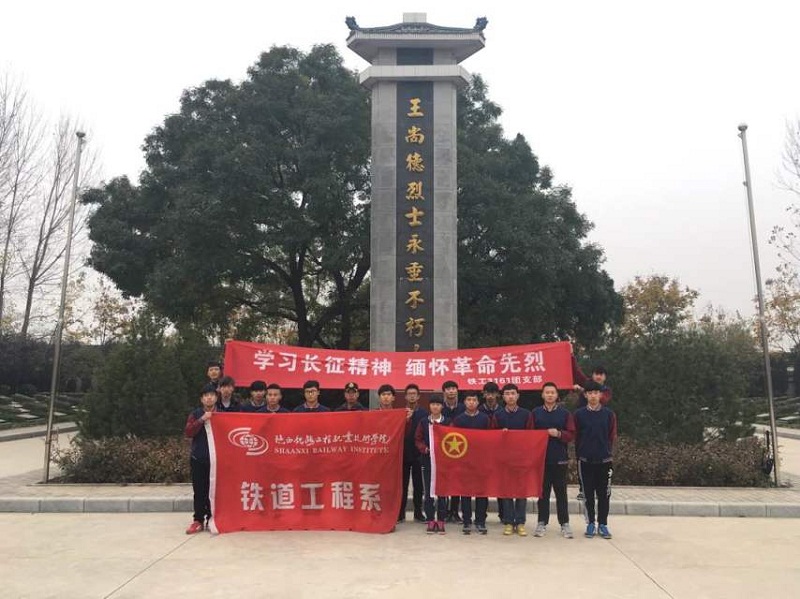 2016年11月23日,为纪念长征胜利八十周年,让学生们感悟到红色文化的熏陶。铁道工程系组织40余名入党积极分子前往王尚德烈士陵园举行 “铭记历史 缅怀先烈 珍爱和平 开创未来”为主题的教育学习活动。现场同学们集体向革命英烈默哀,瞻仰参观了烈士陵墓、向革命烈士表达崇高的敬意和深切的怀念,整个活动庄严有序。默哀结束后大家一起参观了王尚德烈士纪念馆,通过现场参观学习使同学们了解了渭华起义的相关背景,对抗战时期的艰苦生活有了更深一步的体会,最后40余名入党积极分子在革命英烈纪念碑前宣誓,重温了入党誓词,坚定了革命理想信念。