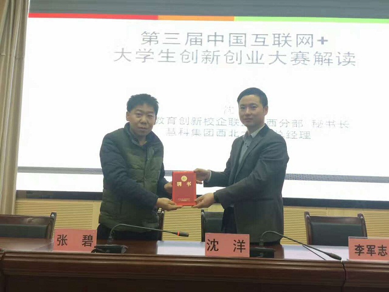 张碧对沈洋的精彩报告表示了诚挚的感谢,并向沈洋颁发了特聘教师聘书。同时,他希望师生积极参赛,通过赛事培养学生的创新创业意识,提升指导老师指导水平。
