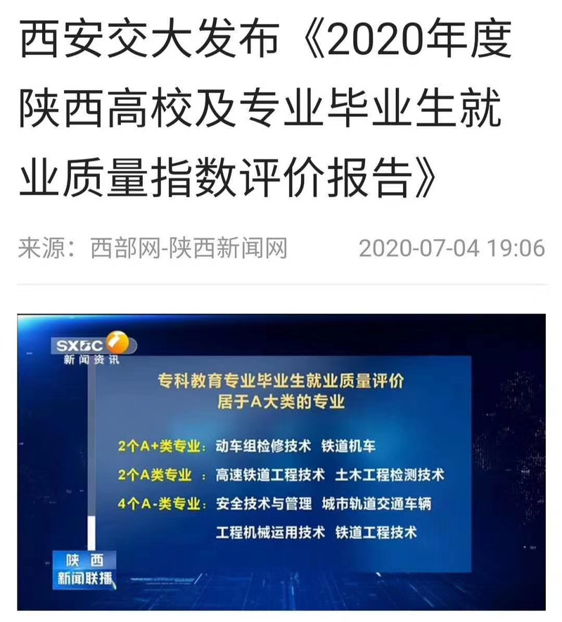 近日,西安交通大学中国西部高等教育评估中心近日发布《2020年度陕西高校及专业毕业生就业质量指数评价报告》报告面向社会公开发布,陕铁院举办的铁道机车、高速铁道工程技术、土木工程检测技术、安全技术与管理、工程机械运用技术、铁道工程技术等多个专业位列A类专业行列。