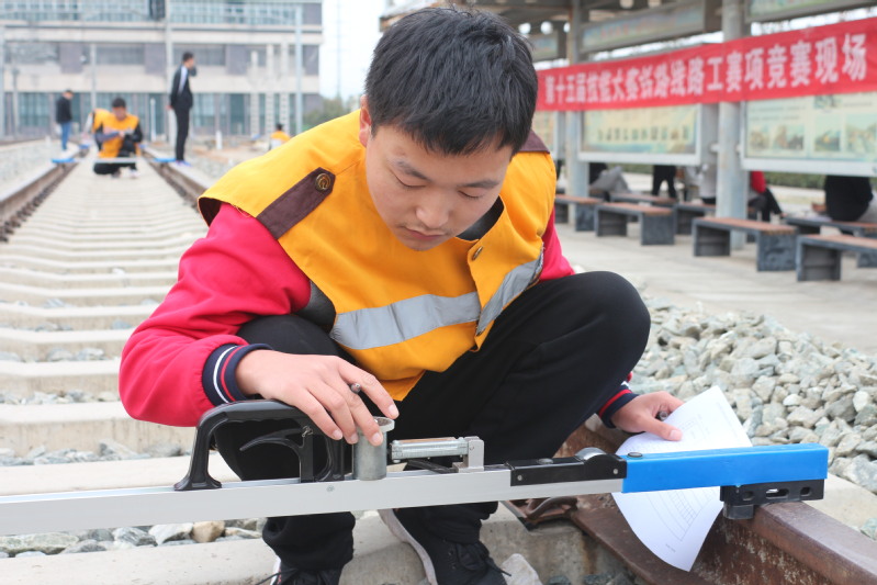 赛事共292人参加,采用个人实操竞赛方式进行,参赛选手利用轨距尺在学院高铁实训工区进行铁路线路检查,将检查结果记录在记录簿上并在在记录簿上勾画超限处所,在记录簿上简单写出整治超限的方法。比赛主要考查学生对铁路线路状态检查以及常见铁路病害分析、铁路养护维修作业的掌握情况,组委会提供给每位选手一份线路检查记录簿和一把道尺,参赛选手需自带黑色中性笔,在记录簿上进行记录和作答,由评委全程监控,根据现场检查和作答的情况给出成绩,考试结束后根据每位选手的成绩进行排名。