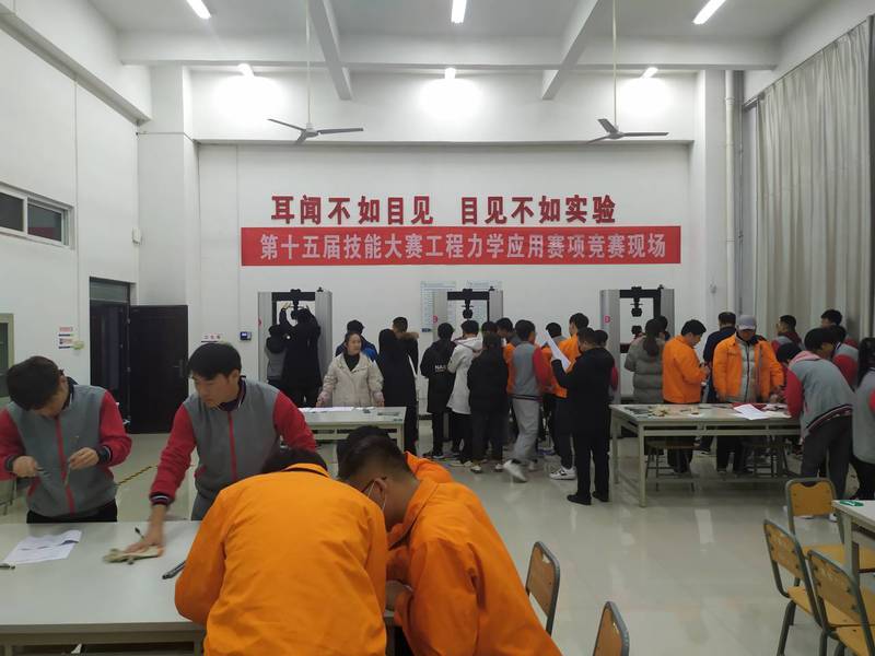 此次赛项要求学生以小组为单位在规定时间内完成铸铁的拉伸试验,通过采集的试验数据评委老师现场打分,通过分数的高低排出比赛名次。参赛选手紧张,严谨,评委老师规范、合理、公正,比赛结束后同学们仍意犹未尽。