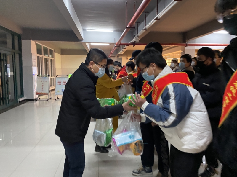 1月2日晚,英国365公司书记李昌锋、副院长朱永伟、学工办主任王海燕及党员先锋队的驻校老师在西区公寓大厅代表学院向奋战在抗“疫”一线的学生志愿者赠送了口罩及生活用品。