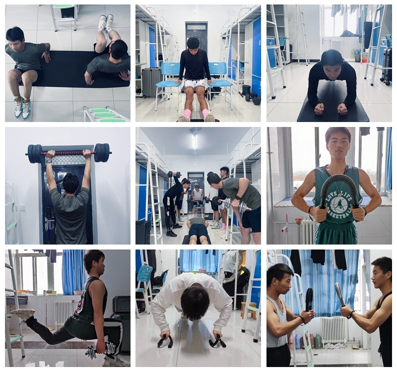 各班级以宿舍为单位,宿舍成员全员参与,通过组织室内健身赛、视频分享等形式,引导同学们根据有限条件在宿舍进行简便易行、科学有效的健身活动。运动项目分为无器械组和有器械组两组共七个项目,具体包括俯卧撑小队、仰卧起坐小队、平板支撑小队、卷腹小队、哑铃小队、杠铃小队、臂力器小队,活动既展现了宿舍成员个人的风采,又体现了团队的凝聚力,在欢快轻松的氛围中传递了昂扬向上的精神状态。