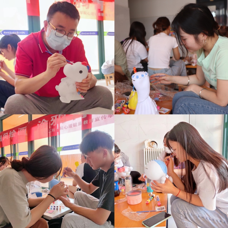活动开始时,李书记首先向同学介绍了大学生常见心理问题、主要压力源以及常用的心理调节方法,然后就开展本次活动的意义和重要性做了说明。随后,活动以两人一组的形式分发石膏模型和涂料,以小组合作的方式进行涂鸦彩绘。在创作过程中,同学们用不同的颜色表达着自己的情感,一勾一画一涂一抹,手中的作品逐渐鲜活起来。李书记还不时的与学生交流颜色的用法搭配心得。活动结束后,同学们纷纷拿着自己的作品合影,定格美丽画面,传递乐观情绪。