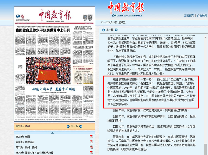 9月27日,《中国教育报》头版以“锻造大国工匠奠基中国制造——新中国70年职业教育改革发展历程”为题介绍了新中国成立以来职业教育改革取得的伟大成绩。陕铁院积极响应国家“一带一路”倡议,助力企业“走出去”,为肯尼亚蒙内铁路培训当地员工的事迹作为典型案例在文中进行宣传展示。