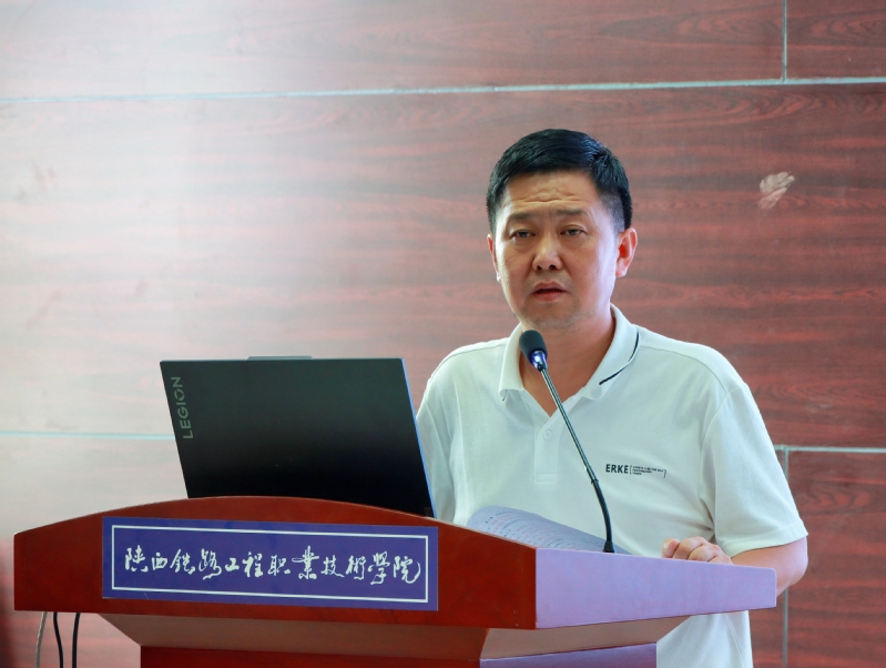 高铁学院党总支副书记赵东以《牢记党的宗旨,践行党的宗旨》为题讲党课,他将中国共产党党员的宗旨、初心与使命同教师的职业和学生的培养相结合,要求全体党员教师要立足岗位要求,不断提高个人修养和能力水平,做“四有”好老师,切实发挥党员模范带头作用。