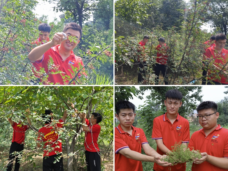 上午趁着天气凉爽,团队成员在村民王祥同志的带领下,前往花椒地采摘花椒。大家在村民王祥同志的指导下,分工进行花椒采摘体验,学习正确的采摘技巧,采摘时,由于花椒本身的特性,采摘过程中,手部的酥麻感比较严重,扎手的情况多有出现,队员们克服采摘花椒过程带来的扎手疼痛感等状况,体会到了农户日常采摘花椒的不易。