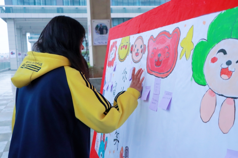 活动中,同学们在便利贴上画下属于自己的笑脸,并贴在展板上,每一张便利贴都承载着同学们的喜悦。在党老师的组织下,同学们在展板上写下30字留言,有不少同学留下了他们对未来的美好憧憬。李同学写道:“不管压力有多大,生活有多忙,学习有多难,我们都要笑着面对生活,面对这个世界,对大家比个耶。” 一张张笑脸,一个个字符,让同学们在忙碌的生活中静下心来,获得了片刻的解压。