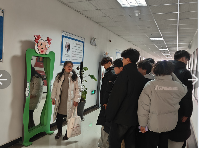 21级辅导员殷殷米锋组织同学们开展活动,大家在镜中展现不同的微笑或表情进行拍照打卡,并通过观察哈哈镜中的扭曲影像,直观地看到内在的感受,增进自我认知。